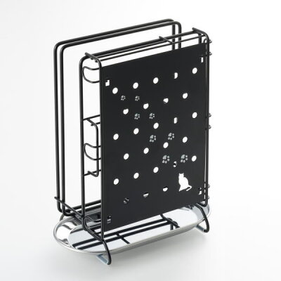 ・ 製品サイズ / 約 幅 15.2 × 奥行 10.2 × 高さ 21.7 cm・ 材質 / 本体、プレート部 : スチール(カチオン電着塗装 +ポリエステル樹脂粉体塗装) トレイ : ステンレス クッションチューブ : シリコーンゴム・ 生産国 / 日本・ 調理小物をかわいいネコと足あとのプレートでおしゃれに目隠し♪