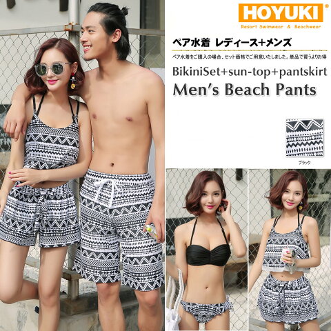 あす楽 ペア水着 まとめ買いでお得!水着 メンズ トランクス+水着 レディース 送料無料 ホユキ カップルお揃い ビーチ水着/S/M/L/LL ビーチパンツ バンドゥビキニ 4点セット ペア商品 短パン ママ 水着 体型カバー ビーチパンツ ホユキ