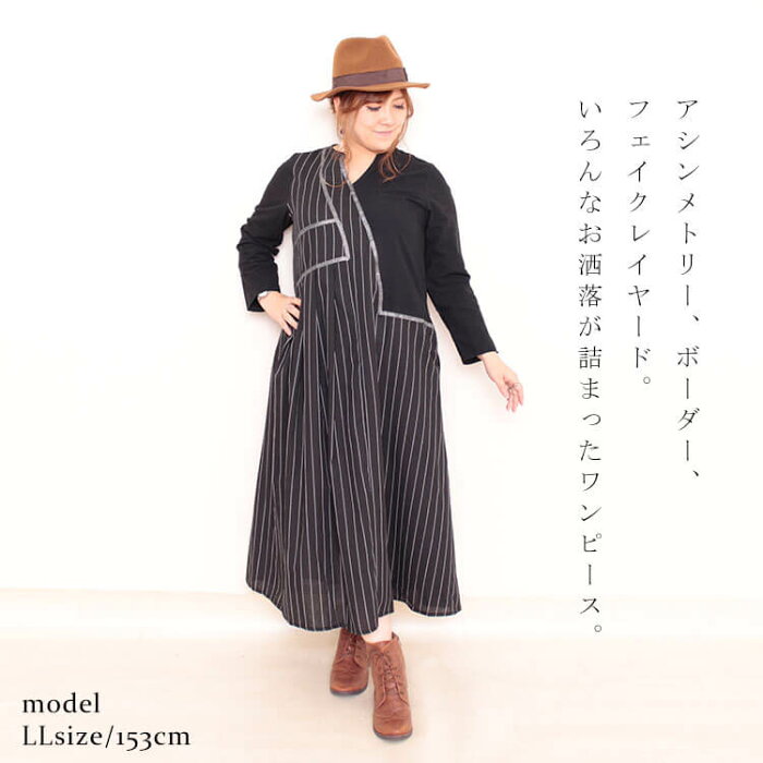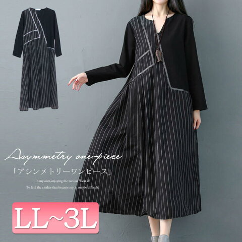 大きいサイズ レディース ワンピース ストライプ 刺繍 生地切り替え フェイクレイヤード風 アシンメトリー 膝下丈 ロング丈 長袖 コットンリネン 綿麻 ブラック 黒 マタニティ マタニティウェア おしゃれ 流行 トレンド オータム ゆったり 体型カバー LL 3L 韓国ファッション