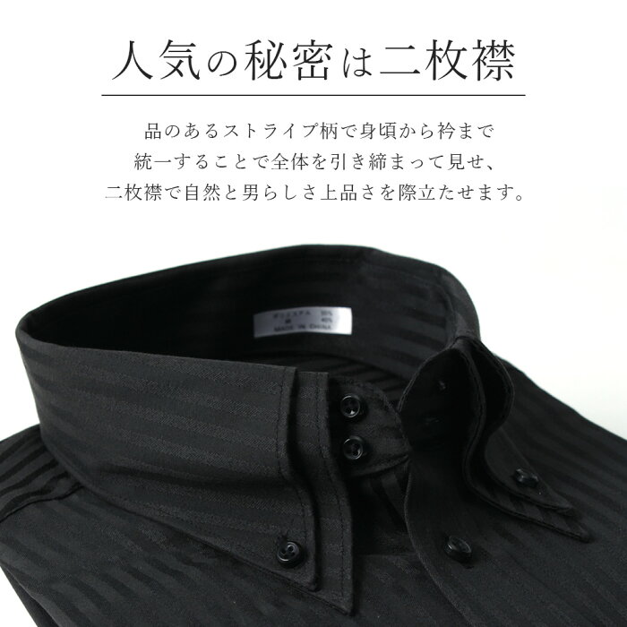 【男が際立つ黒のストライプ】 襟高デザイン ドレスシャツ 長袖 ワイシャツ Yシャツ 形態安定生地 メンズ ビジネス 結婚式[黒 ストライプ 2枚衿 ボタンダウン スリム 大きいサイズ LL 3L 春 夏 クールビズ カッターシャツ 制服 あす楽 送料無料