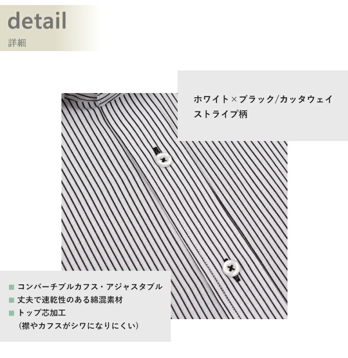 「仕事がデキる」「取引先や上司にウケる」「女性にモテる」ビジネスシーンやドレスシーンでのキレイめスタイルに是非取り入れてみてはいかがですか?型番SHDZ15-19店舗用管理番号exc0 obyn gg310商品情報・長袖・当店オリジナルモデル・丈夫で速乾性のある綿混素材・イージーケア素材・ポケット数×1・スペアボタン・襟やカフスの型崩れを防ぐトップヒューズ加工サイズ・素材・カラー8サイズ展開(S/M/L/LL/3L/スリムS/スリムM/スリムL)綿25% ポリエステル75%(お手入れもしやすく、イージーケア性の高い生地)ホワイト×ブラック付属品-この商品のお問い合わせ番号TSR-item-52930